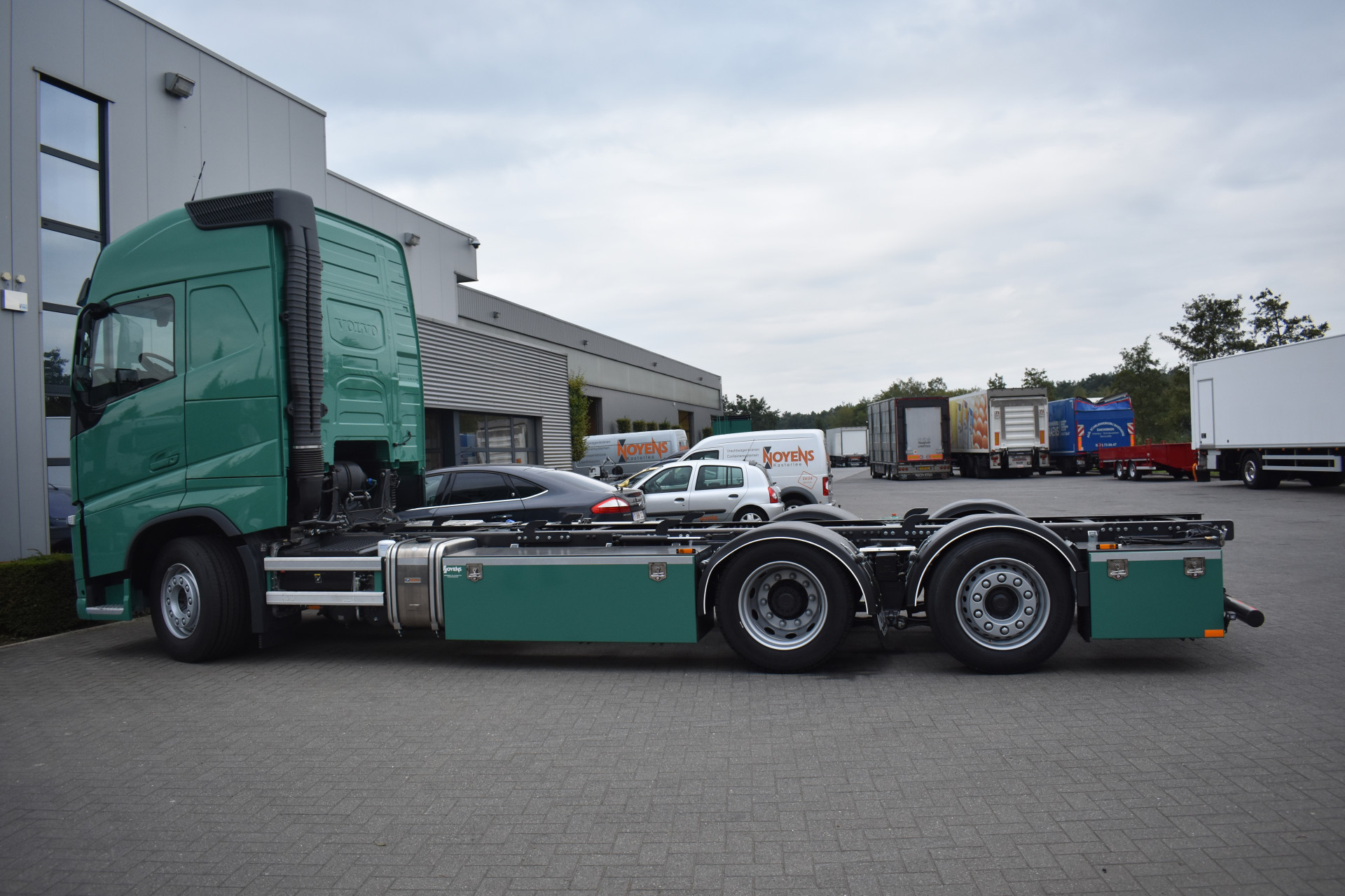 Deze open laadplateau kan afgezet worden d.m.v. de luchtvering van de vrachtwagen. Het chassis werd voorzien met 4 gereedschapskoffers op maat.