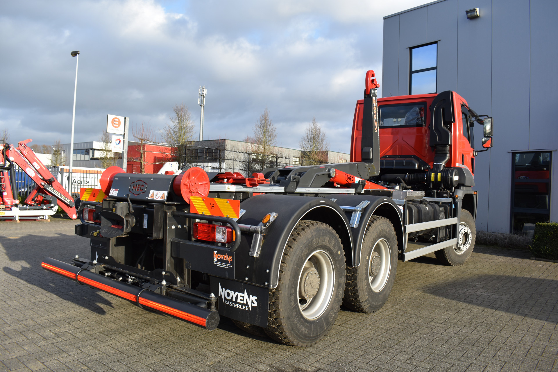 Deze 6x4 werd voorzien van een 20T containerhaaksysteem. Met een korte wielbasis van 3.800 mm is deze wagen zeer wendbaar! Dankzij de hydraulisch uitschuifbare achterbumper kunnen containerlengtes tot wel 6,20 meter getransporteerd worden.