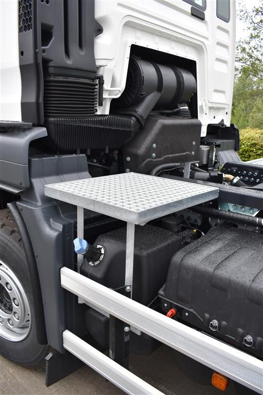 Achter de cabine hebben we een trap voorzien zodanig de chauffeur zich via de cabine kan verplaatsen tot vooraan de container.