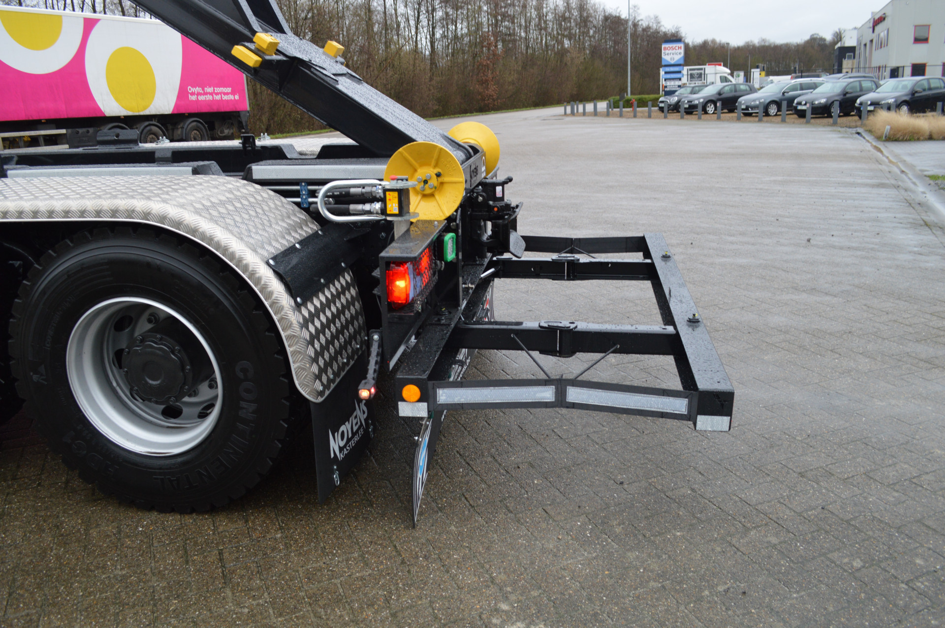Voor onze geburen in het Biezenveld, Bailloux & zonen, gespecialiseerd in vloerwerken, bouwden wij een 20T containersysteem op. Het chassis werd netjes afgewerkt met een verzinkt zeilrek, een gereedschapskoffer op maat en een hydraulisch uitschuifbare bumper. Aangezien ze een bestaande container hebben met een laadkraan, voorzagen wij ook alle hydraulische aansluitingen d.m.v. een multifaster.