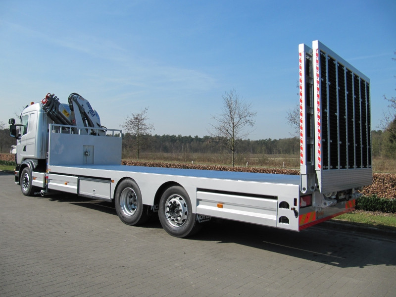 Laadkraan Copma 160.4 met open laadplateau en Dhollandia oprijramp op Scania in Averbode