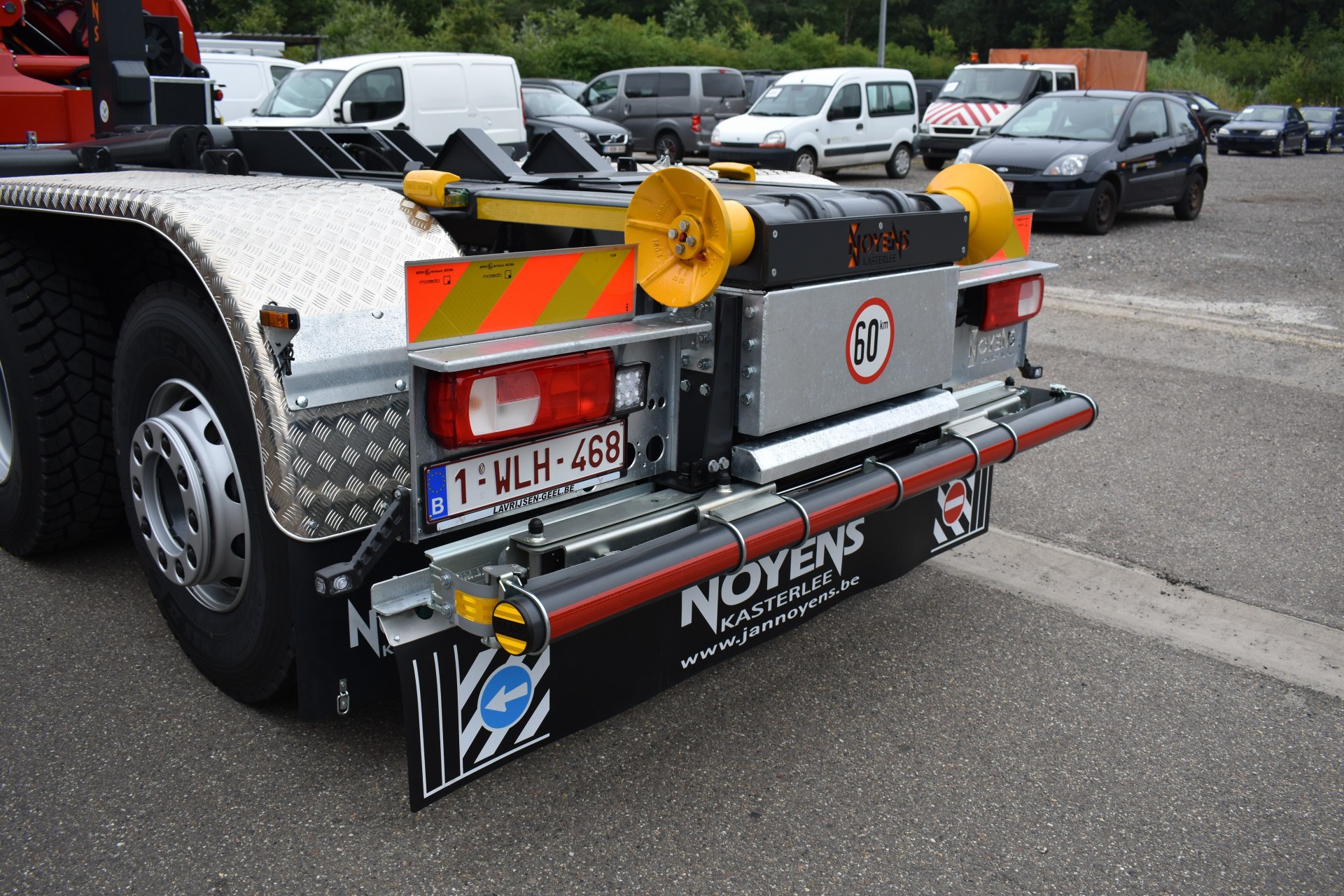 Het containersysteem werd vooraan verlengd voor montage van de laadkraan. De opbouwhoogte bedraagt slechts 180 mm. Achteraan werd gekozen voor een hydraulisch uitschuifbare bumper om verschillende containerlengtes te kunnen hanteren met een zo kort mogelijke wielbasis.