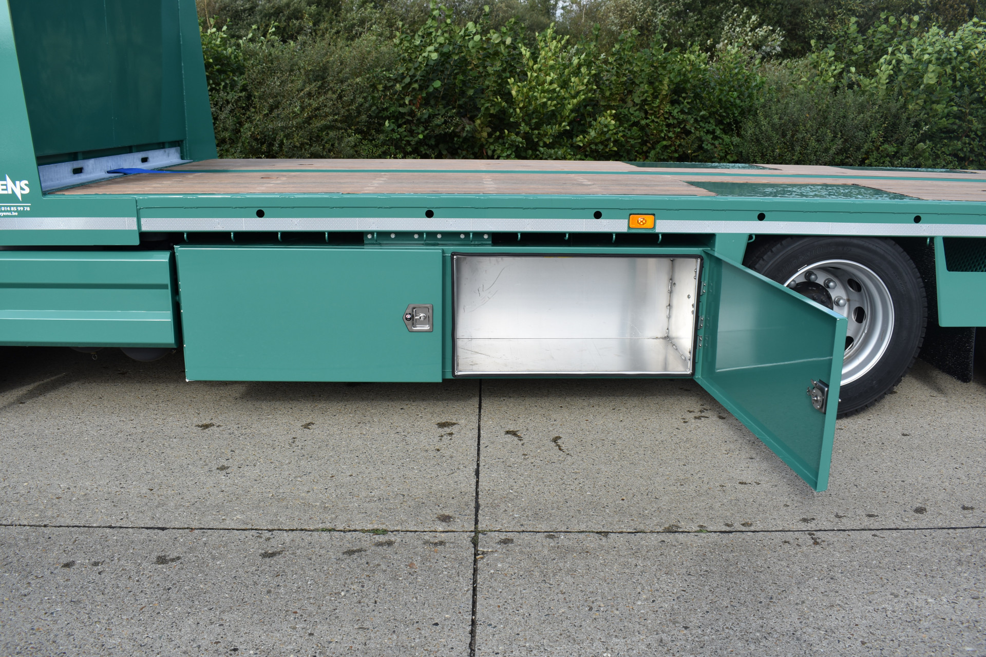 Het chassis werd afgewerkt met grote gereedschapskoffers op maat in alu uitvoering & open laadvakken tussen de achterwielen.