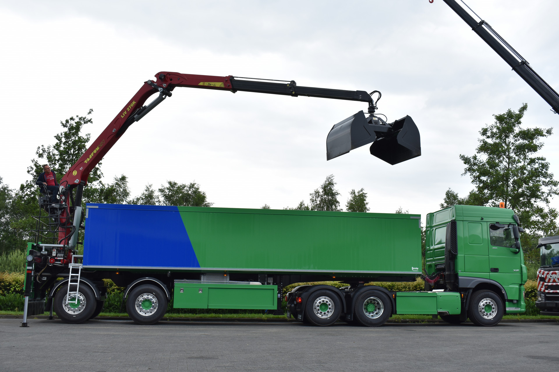 Voor Braspenning - Van Dingenen construeerden wij een chape-oplegger volledig op maat. De oplegger is voorzien van een TRIDEC stuursysteem. Achteraan het chassis installeerden wij een laadkraan geschikt voor dagelijks grijp-werk. De laadkraan is geclassificeerd in de H1B4 klasse, gekend voor zijn robuustheid en kunnen tot meer dan 600.000 werkcycli aan, in tegenstelling tot gewone autolaadkranen.