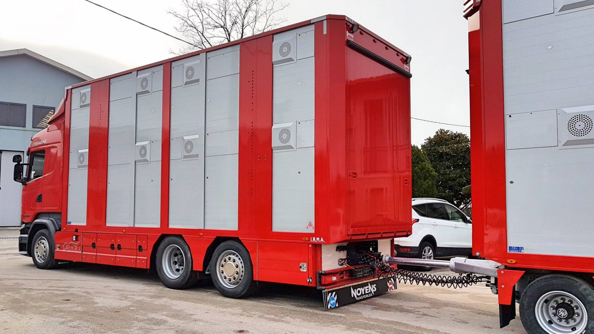 Een fonkelnieuwe combinatie voor Gebroeders Poll uit Schalkhaar (NL). Zowel de vrachtwagen als aanhangwagen hebben 2 laadvloeren en zijn gekeurd voor > 8h transport. Het debiet van de ventilatoren kan afgeregeld worden met een potentiometer. Een op maat gemaakte hydraulisch verstelbare dissel zorgt voor de koppeling tussen vrachtwagen en aanhangwagen. De laadramp werd zo breed mogelijk genomen om het laden te vergemakkelijken. Veel veilige kilometers gewenst met deze knappe combi!