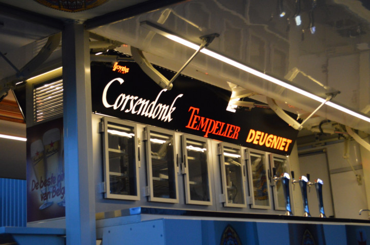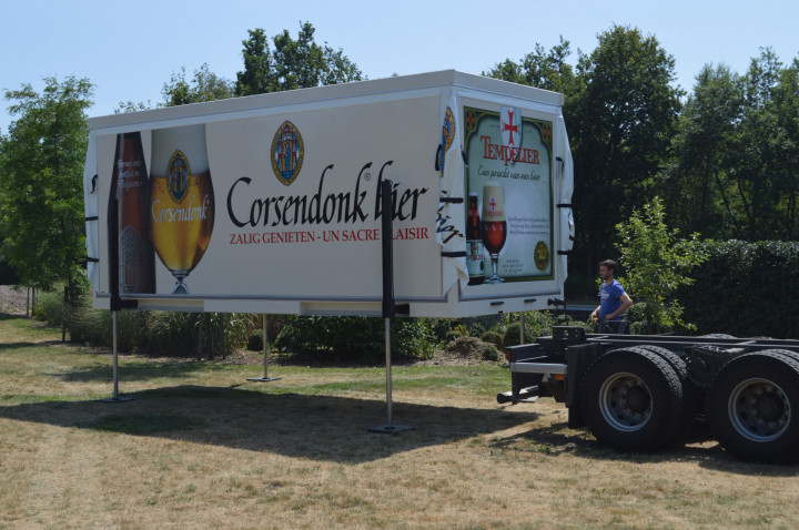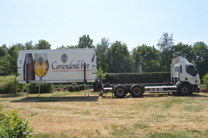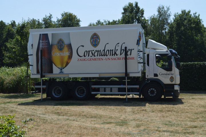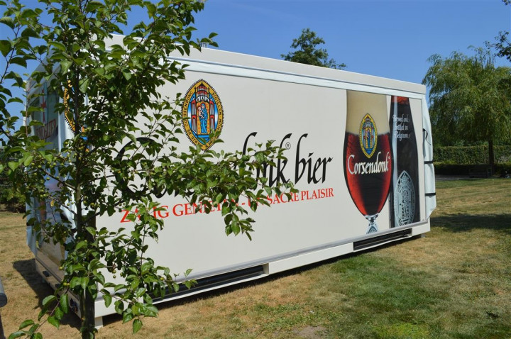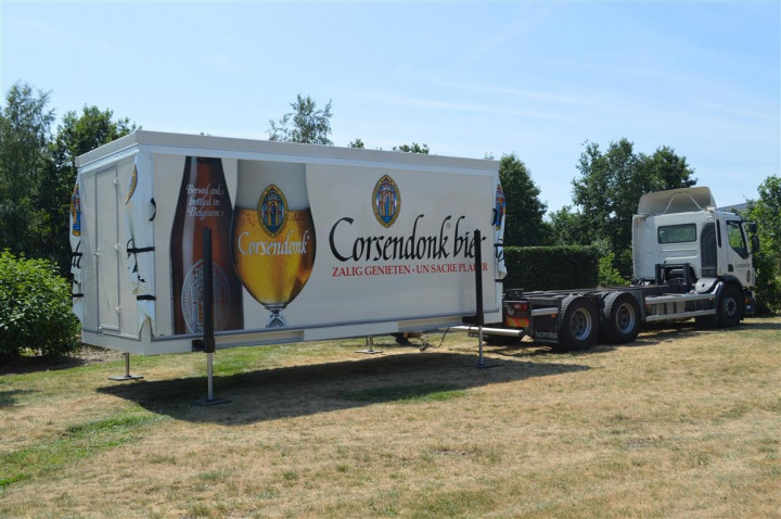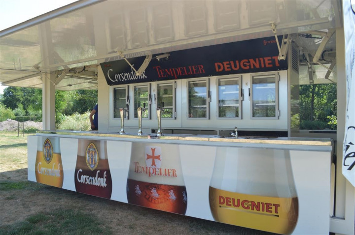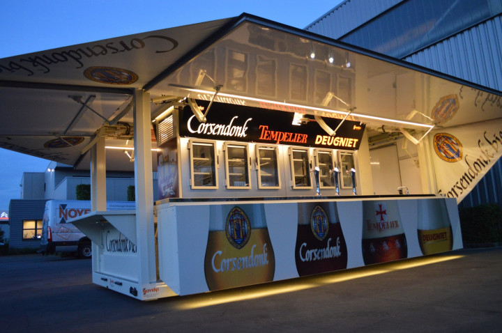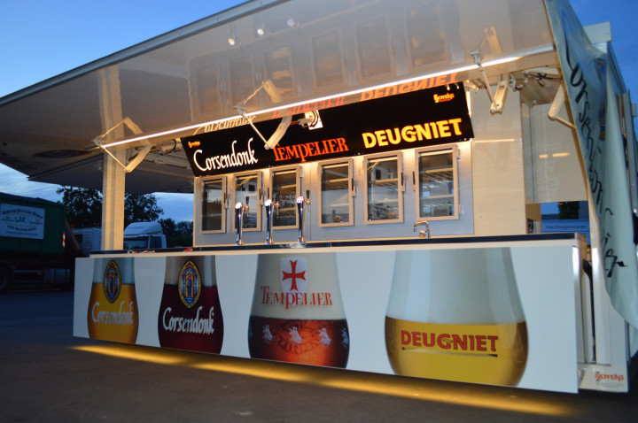 Tapwagen met hydraulische afzetpoten, hydraulisch nivelleersysteem voor waterpasstelling, hydraulische togen en hydraulische valluiken. Deze zal ingezet worden als mobiele bar.