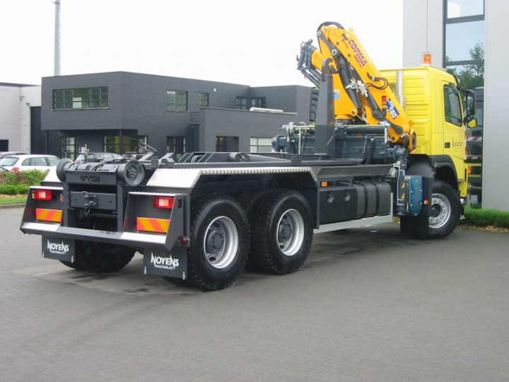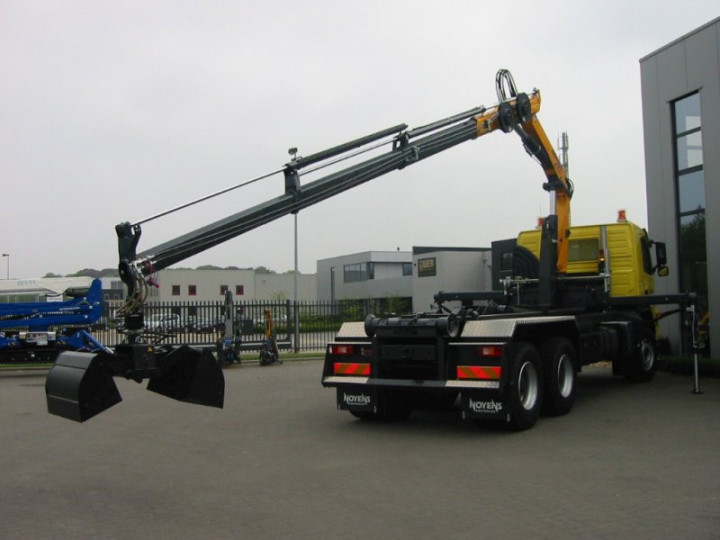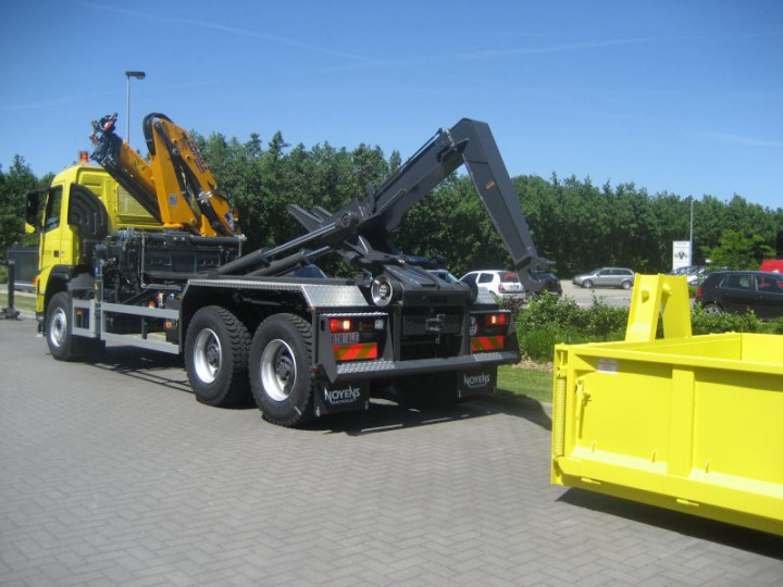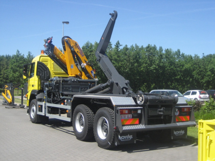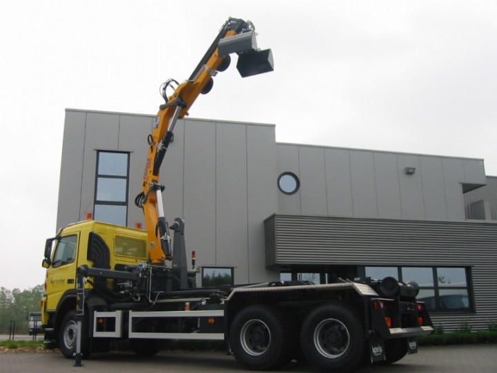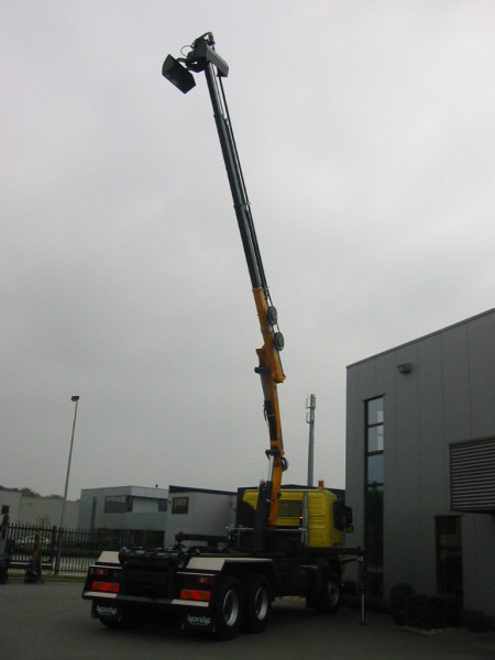 Gemeente Kasterlee op weg met de COPMA 160.3 met hydraulische leidingen tot achteraan voor bediening van rotator + grijper. Een Busi Group containersysteem van 20 ton capaciteit werd voorzien achter de laadkraan.