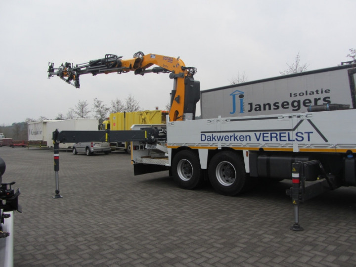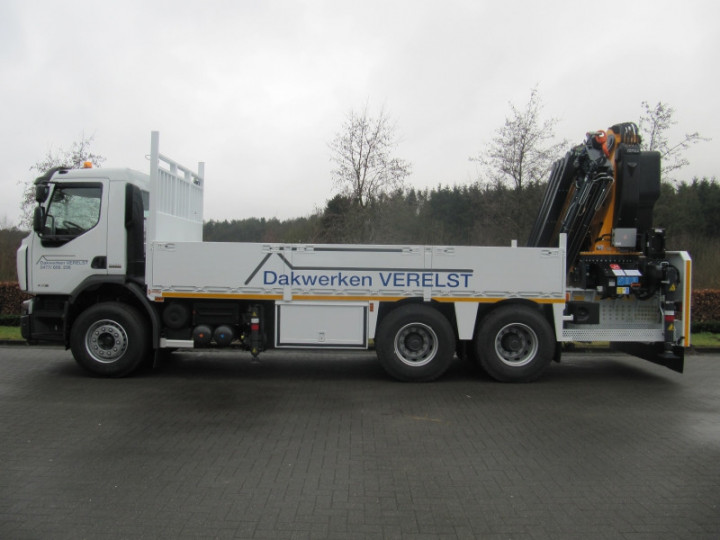 Copma laadkraan 360.6J4 voor Dakwerken Verelst gemonteerd achteraan het chassis. De laadkraan is uitgerust met een winch en fly-jib. De open laadbak werd op maat geconstrueerd. Achter de achteras construeerden we een open rek.