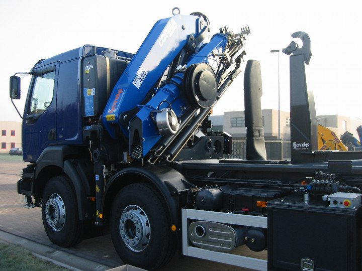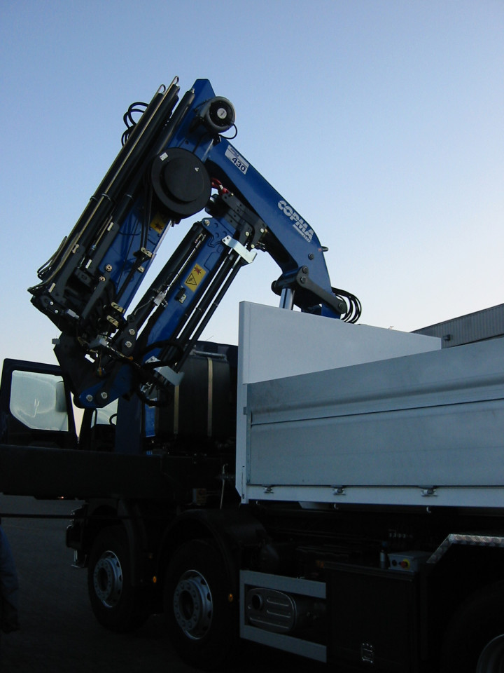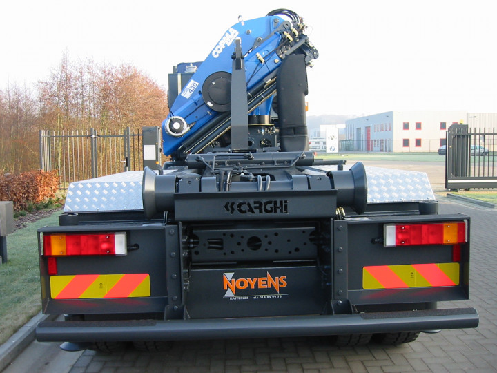 Copma laadkraan 430, 6x hydraulisch uitschuifbaar + Flyjib 4x hydraulisch uitschuifbaar. Deze werd gecombineerd met een BUSI GROUP containersysteem.