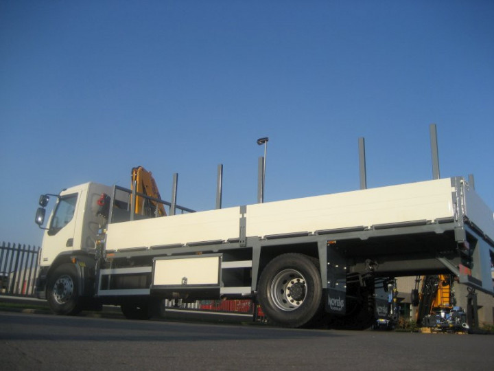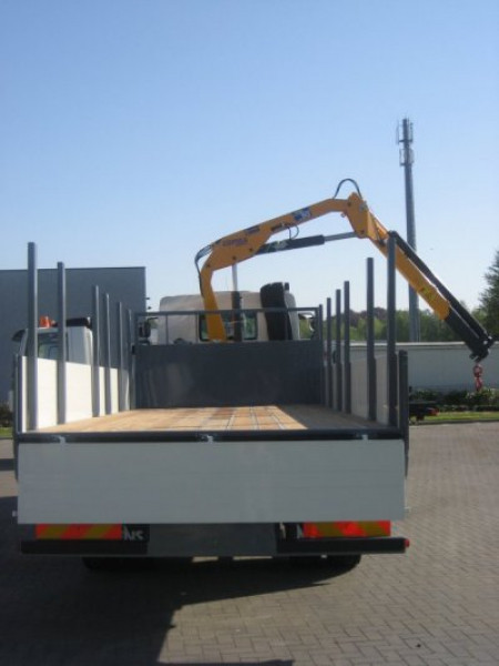 Een Copma laadkraan gemonteerd achter de cabine met een open laadbak op maat. Naast het chassis werd een gereedschapskoffer voorzien.