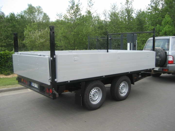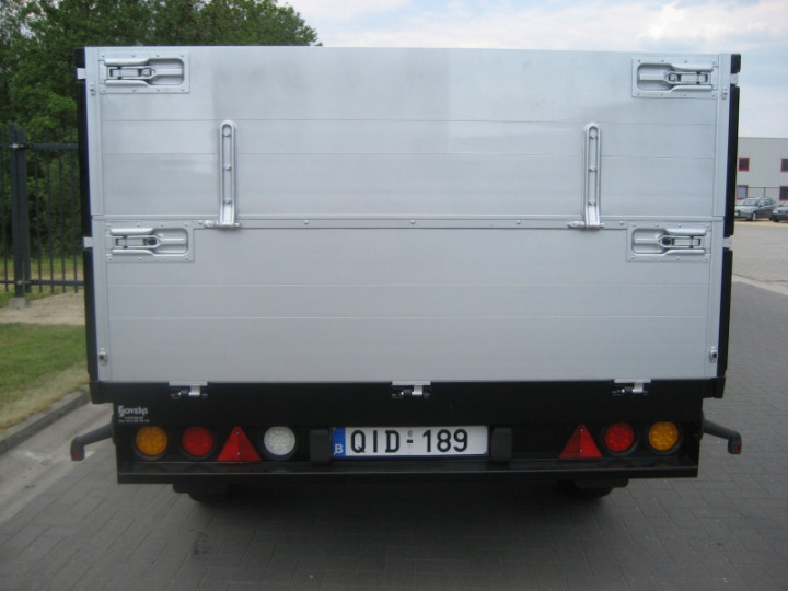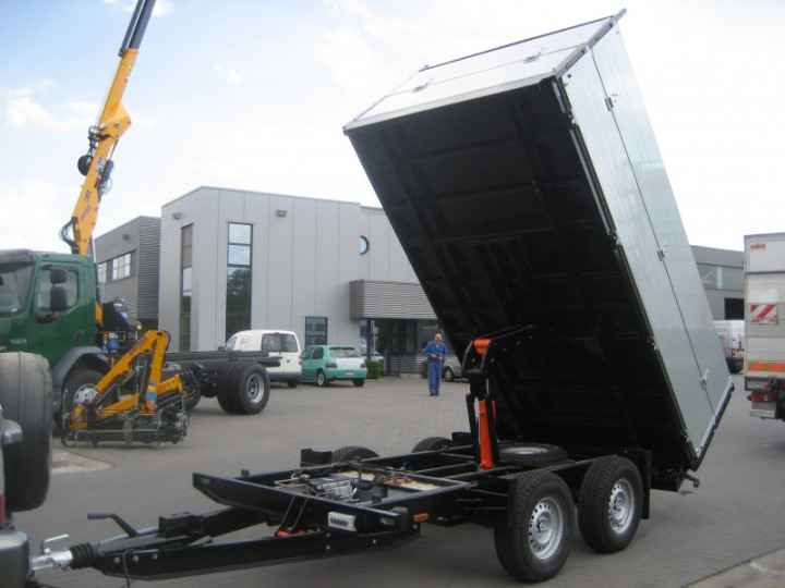Eigen constructie van kipper aanhangwagen met open laadbak en alu zijborden.