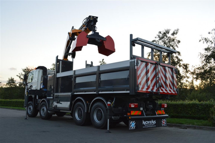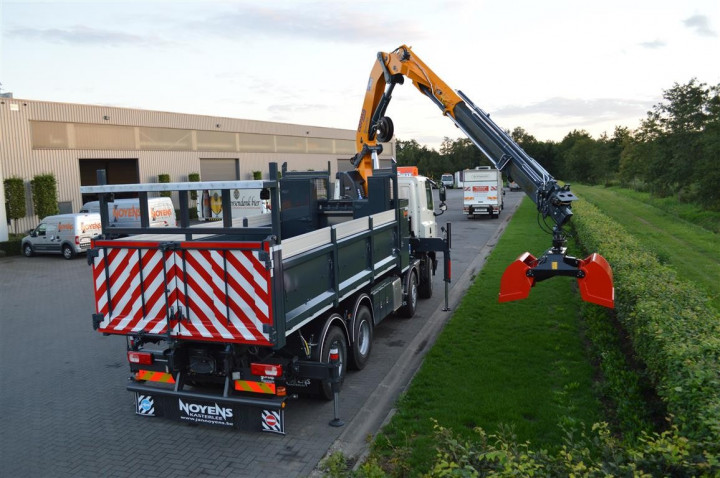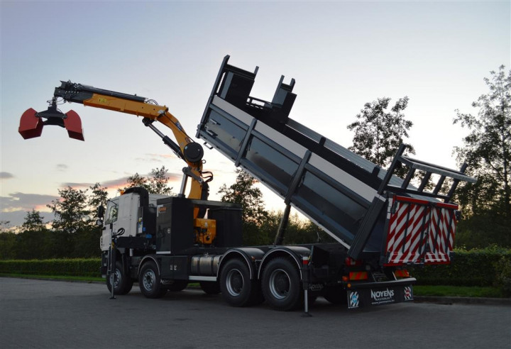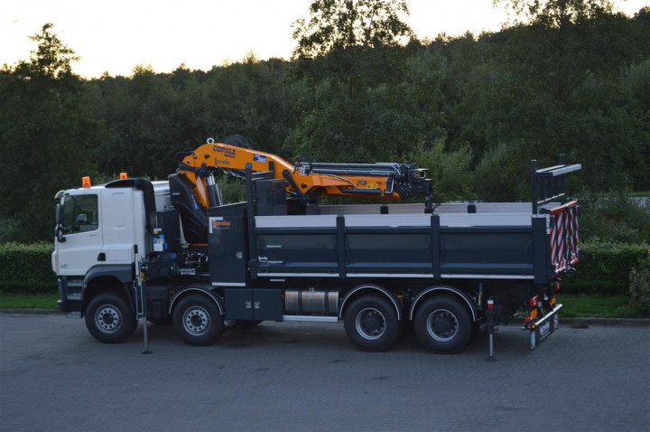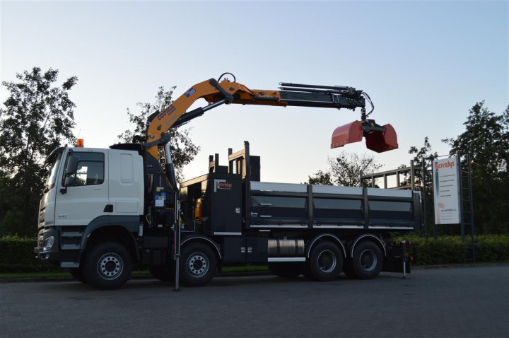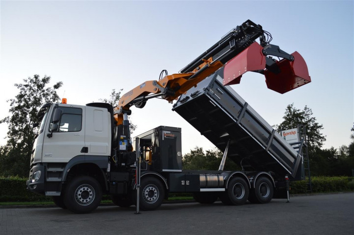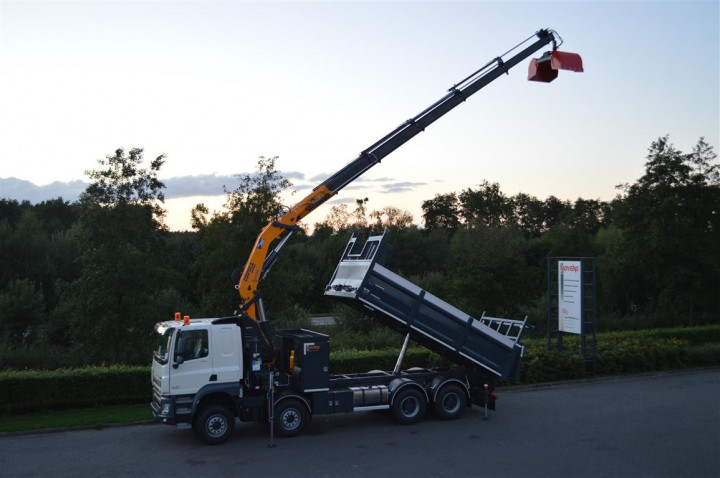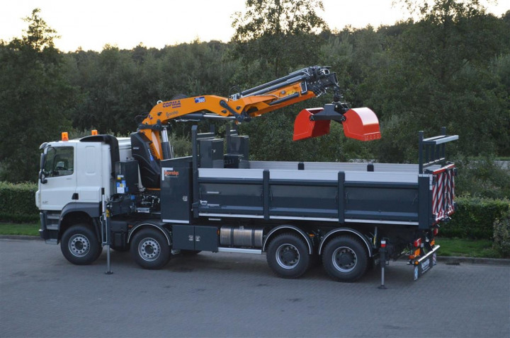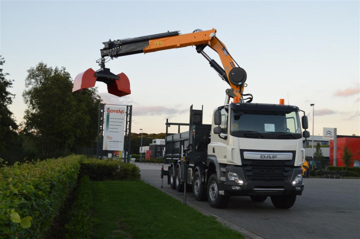 Grue de chargement Copma 360.5 avec grappin et benne basculante sur DAF à Rocourt
