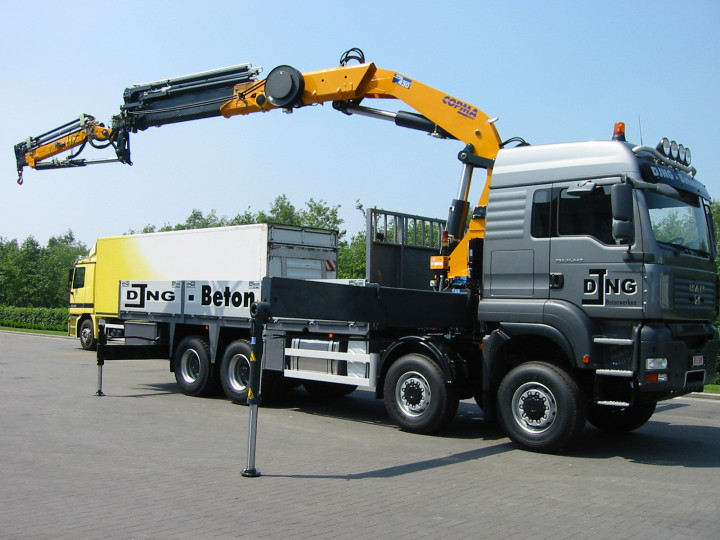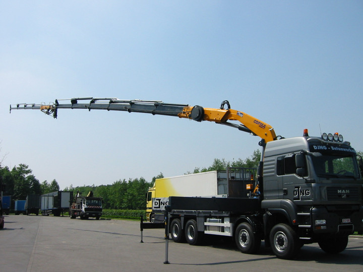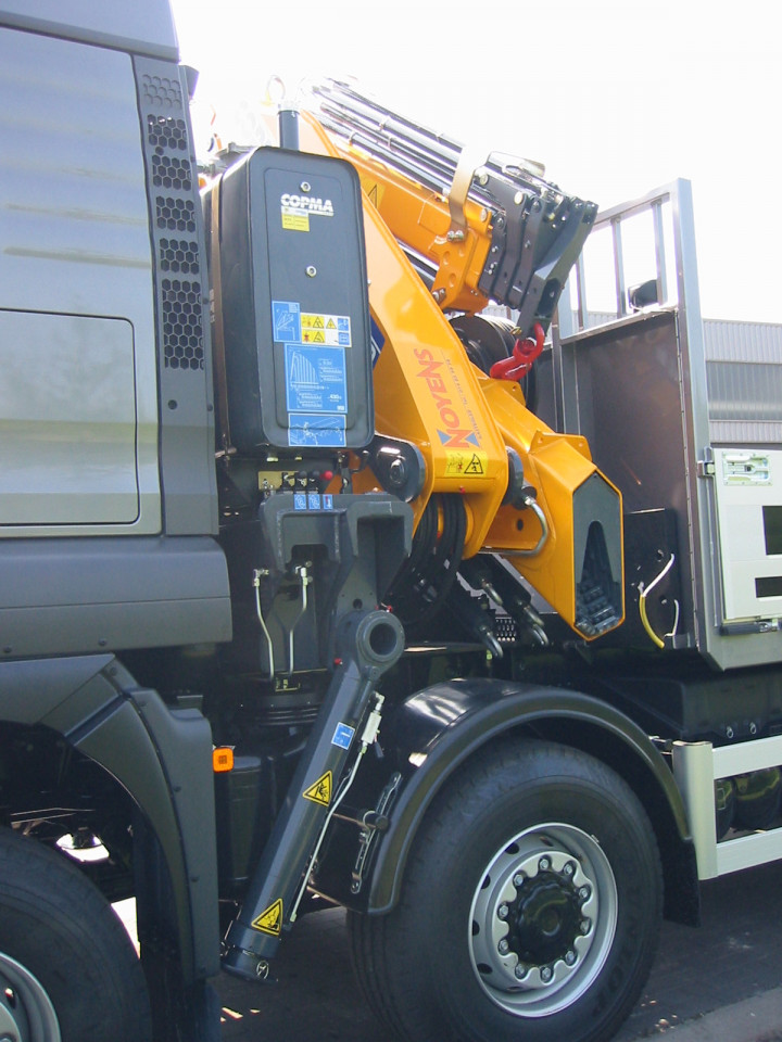 Grue de chargement Copma 430.6J4 avec benne de chargement ouverte sur MAN à Kasterlee