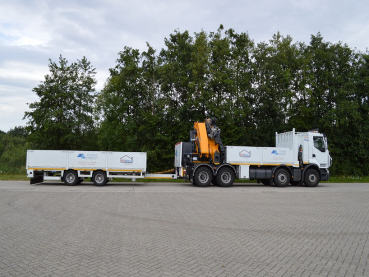 Een middenassige aanhangwagen op maat met open laadbak en zijborden voor Zolderse dakprojecten.