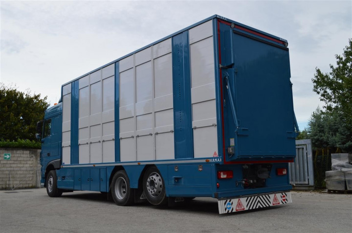 Deze Daf werd opgebouw in Italië bij IRMA. Hij heeft 2 laadvloeren, waarvan er één d.m.v. hydraulische cilinders kan opgetild worden. Ook het dak kan hydraulisch worden versteld in hoogte. Dankzij de automatische vergrendeling kan de laadvloer vergrendeld worden op de meest gebruikte ladingsstanden. De onderzijde van de laadkast werd netjes dichtgewerkt.