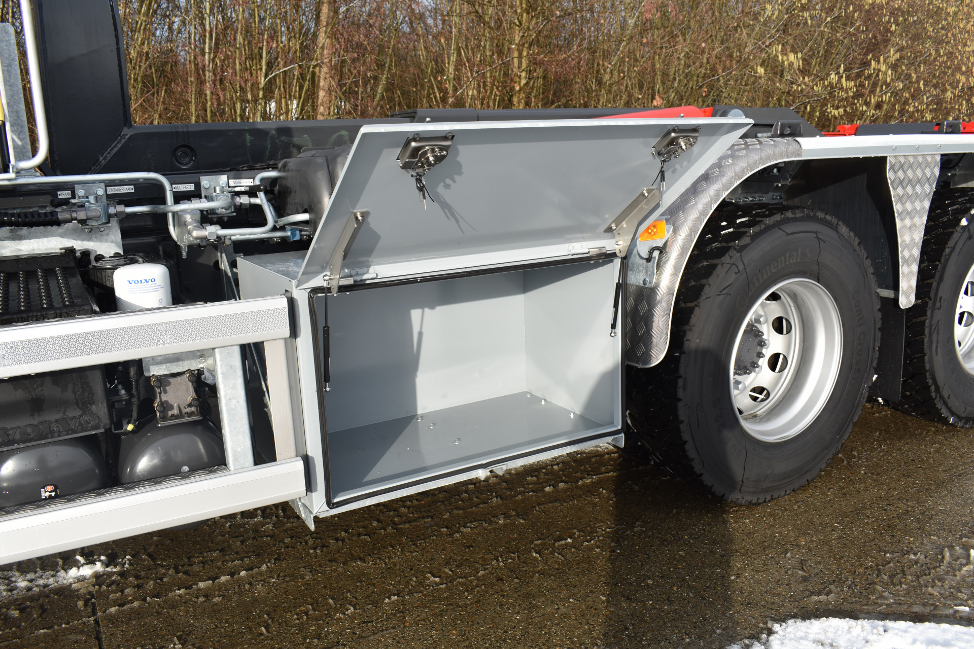 Langs het chassis werd een gereedschapskoffer gemonteerd. Alle opbouwcomponenten werden degelijk geconstrueerd en thermisch verzinkt.