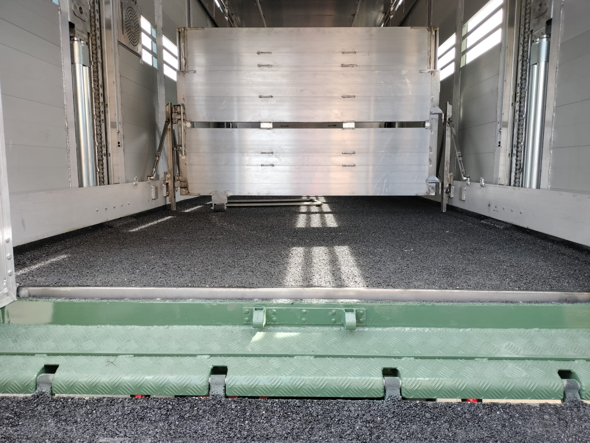 De volledig in aluminium uitgevoerde constructie zorgt voor een laag eigen gewicht en een strak geheel. De laadvloeren zijn uitgerust met antislipvoorziening en 2 + 2 binnendeuren. Achteraan werd de hydraulische laadramp opnieuw volledig geïntegreerd voor een vlakke achterzijde.